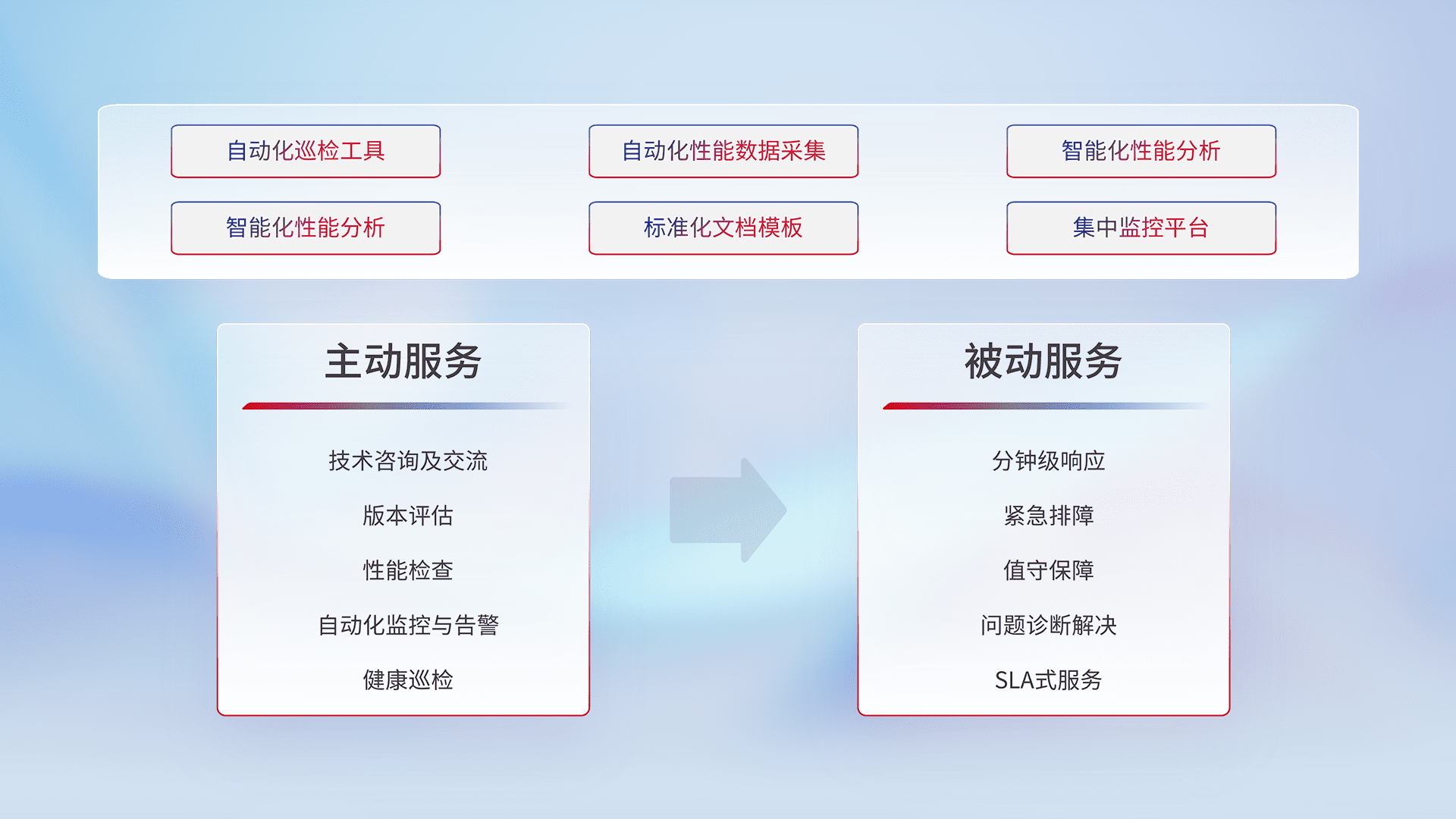 智能化工具和标准化文档,,,保障服务质量,,提供主动服务(包含技术咨询、、版本评估、、、、性能检查、、自动化监控与告警、、、、健康巡检)和被动服务包含(分钟级响应、、、、紧急排障、、值守保障、、问题诊断解决、、SLA服务)。。。